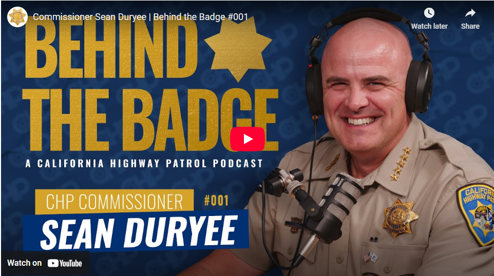 Step inside the California Highway Patrol like never before. In the very first podcast episode, Commissioner Sean Duryee sits down to share his vision, leadership, and the stories that shape the CHP’s commitment to Safety, Service, and Security. Watch or listen to “Behind the Badge“. Catch it on the California Highway Patrol Instagram, YouTube channel, and Spotify.